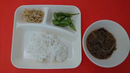 今日の献立は、「マーボーなす」「もやしのごま酢あえ」「枝豆」「ごはん」「牛乳」です。「マーボーなす」は、旬のなすを使用した、子どもたちに好評な献立です。