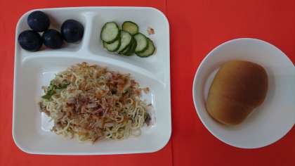 今日の献立は、「和風焼きそば」「きゅうりの辛みづけ」「ぶどう(巨峰)」「黒糖クレセントロールパン」「牛乳」です。今回は、しょうゆ味で仕上げた焼きそばです。かつおぶしをかけて風味と旨味を増しています。