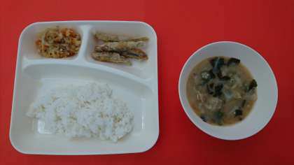今日の献立は、「いわしてんぷら」「みそ汁」「切り干しだいこんのいため煮」「ごはん」「牛乳」です。切り干しだいこんは、だいこんを細く切って干したものです。干すことで、うまみと栄養価が増えます。