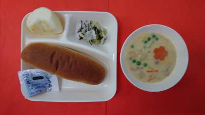 今日の献立は、「コーンクリームシチュー」「キャベツのひじきドレッシング」「りんご」「コッペパン」「牛乳」です。今日のコーンクリームシチューは、上新粉でとろみをつけています。