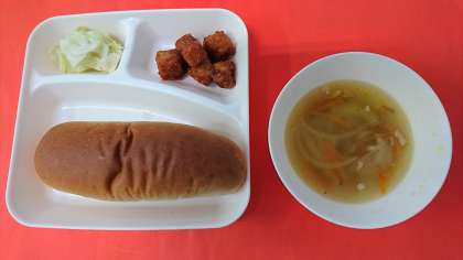 今日の献立は、「まぐろのオーロラ煮」「じゃがいものスープ」「サワーキャベツ」「黒糖パン」「牛乳」です。「まぐろのオーロラ煮」は、しょうが汁で下味をつけたまぐろにでんぷんをまぶして揚げ、ケチャップ、砂糖、赤みそで作ったタレをからませます。魚の臭みがなく人気のある献立です。