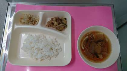 今日の献立は、「鶏肉のごまだれ焼き」「ソーキ汁」「もやしのしょうがじょうゆあえ」「ごはん」「牛乳」です。ソーキ汁は、豚ばら肉、切りこんぶを使用した沖縄の郷土料理です。豚ばら肉をいったんゆでて、余分な脂を落とす工夫をしています。