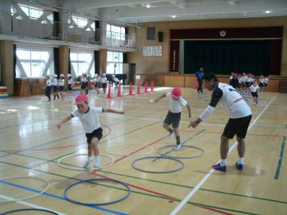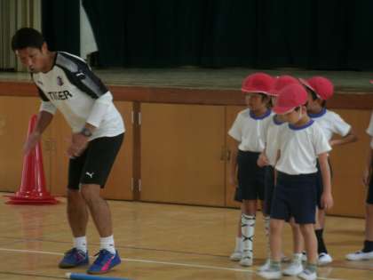 体力向上推進プログラムとして、元サッカー日本代表の勝矢寿延選手にお越しいただきました。講堂で体力づくりの特別授業を行いました。その後、子どもたちと一緒に給食を食べていただきました。勝矢選手は26日(木)も弁天小学校に来て下さいます。
