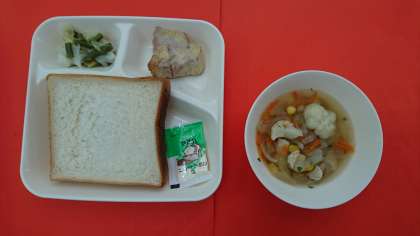 今日の献立は、「かつおのガーリックマヨネーズ焼き」「スープ」「キャベツと三度豆のサラダ」「食パン・マーガリン」「牛乳」です。