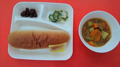今日の献立は、「豚肉と野菜のカレー煮」「サワーサラダ」「うずら豆のグラッセ」「コッペパン・アプリコットジャム」「牛乳」です。豆は、子どもたちに食べてほしい食材のひとつです。今回は、グラッセとして、バターの風味を効かせ、食べやすく仕上げています。