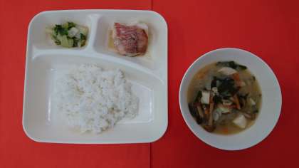 今日の献立は、「赤魚のしょうゆだれかけ」「なめこのみそ汁」「はくさいのごまあえ」「ごはん」「牛乳」です。塩で下味をつけて焼いてタレをかけた赤魚は、子どもたちにとても好評な献立です。