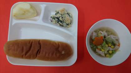 今日の献立は、「スープ煮」「ほうれん草のグラタン」「りんご」「レーズンパン」「牛乳」です。ほうれん草は、現在は1年中、全国で生産されていますが、冬が旬の野菜です。