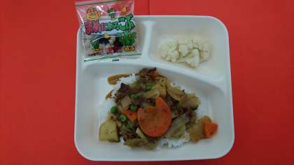 今日の献立は、「ビーフカレーライス」「カリフラワーのサラダ」「豆こんぶ」「牛乳」です。ビーフカレーライスは、子どもたちにとても好評な献立です。