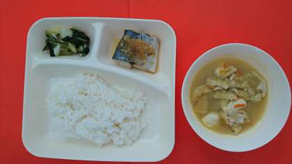 今日の献立は、「さごしのおろしじょうゆかけ」「けんちん汁」「こまつなとはくさいの甘酢あえ」「ごはん」「牛乳」です。「けんちん汁」は、さといも、にんじん、れんこん、とうふ、うすあげなどの材料をいためてコクを出して仕上げる汁ものです。