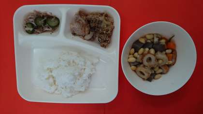 今日の献立は、「豚肉のごまだれ焼き」「大豆の煮もの」「切り干しだいこんのしそ甘酢づけ」「ごはん」「牛乳」です。平成28年度の学校給食献立コンクール最優秀賞作品をもとにした献立です。「食物繊維たっぷりの切り干しだいこん、きのこ、大豆、れんこん、ごまなどを使って、おなかをすっきりさせる健康メニュー」です。