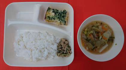 今日の献立は、「千草焼き」「みそ汁」「ツナっ葉いため」「ごはん」「牛乳」です。千草焼きは、新食品のささみ(水煮)を使用しています。脂肪分が少なく、淡白な風味のあるのが特徴です。