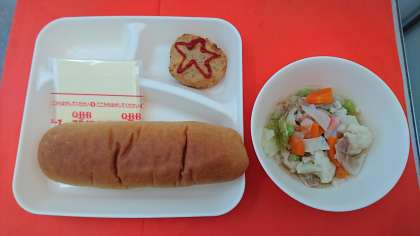 今日の献立は、「とうふハンバーグ」「スープ煮」「スライスチーズ」「黒糖パン」「牛乳」です。給食室でひとつひとつ形を作って焼き物機で蒸し焼きした手作りのハンバーグです。