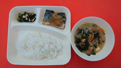 今日の献立は、「さばのみぞれかけ」「みそ汁」「こまつなのいためもの」「ごはん」「牛乳」です。こまつなは寒さに強く、冬が旬の野菜です。