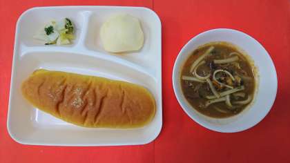 今日の献立は、「カレーうどん」「はくさいの甘酢あえ」「りんご」「パンプキンパン」「牛乳」です。カレーうどんは、寒い時期に体の温まる一品です。子どもたちにとても好評でした。