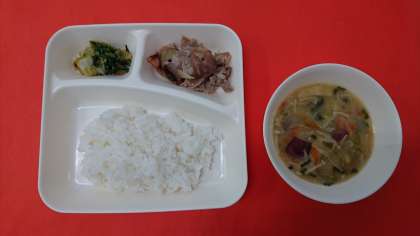 今日の献立は、「豚肉のしょうが焼き」「さつまいものみそ汁」「きくなとはくさいのごまあえ」「ごはん」「牛乳」です。きくなは、少し苦みのある野菜ですが、はくさいと合わせて、いりごま、砂糖、しょうゆであえ、食べやすい味つけにしています。きくなもはくさいも冬が旬で鍋物によく使われる野菜です。