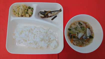 今日の献立は、「いわしのしょうが煮」「うすくず汁」「高野どうふの卵とじ」「ごはん」「牛乳」です。うすくず汁は、水どきでんぷんでとろみをつけることで冷めにくくした、体の温まる汁ものです。