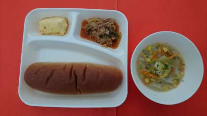 今日の献立は、「豚肉のケチャップソテー」「コーンスープ」「焼きプリン」「黒糖パン」「牛乳」です。給食のプリンは給食室で作る手づくりのプリンです。底に敷くカラメルソースも砂糖を焦がして作ります。(写真1)甘さとカラメルソースの程良い香ばしさが人気の献立です。明日は、冬野菜のカレーライスが登場します。