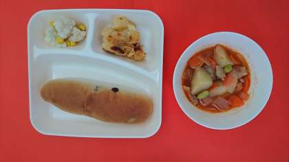 今日の献立は、「鶏肉と野菜のケチャップ煮」「カリフラワーとコーンのサラダ」「桃のクラフティ」「レーズンパン」「牛乳」です。クラフティは、フランスの焼き菓子の1つです。給食では、白桃の缶詰を使って生地をミニバットに流し入れて焼きます。