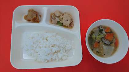 今日の献立は、「鶏肉と白ねぎのいため煮」「のっぺい汁」「焼きかぼちゃのごまだれかけ」「ごはん」「牛乳」です。のっぺい汁は、日本全国にある郷土料理で、寒い時期に体の温まる一品です。明日は、ほたて貝のグラタンが登場します。
