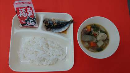 今日は節分の行事献立「いわしのしょうがじょうゆかけ」「含め煮」「いり大豆」「ごはん」「牛乳」です。関西地方では節分に恵方巻きを食べる習慣があります。今年の恵方は南南東です。