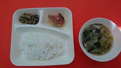 今日の献立は、「赤魚のレモンじょうゆかけ」「うすくず汁」「高野どうふのいり煮」「ごはん」「牛乳」です。赤魚のレモンじょうゆかけは、白身のあっさりとした赤魚を、レモンのさわやかな香りと酸味を添えたしょうゆだれで味わえるようにと考えた献立です。国産のレモンを使用しています。高野どうふのいり煮は、不足しがちな鉄を多く含む高野どうふの粉末と豚挽肉等を合わせていり煮にした、ご飯によく合う一品です。