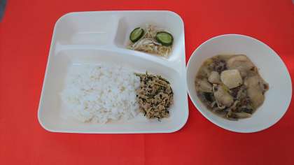 今日の献立は、「すき焼き煮」「もやしときゅうりのしょうがづけ」「ツナっ葉いため」「ごはん」「牛乳」です。すき焼き煮は、毎回子どもたちに好評な献立です。