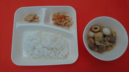 今日の献立は、「関東煮」「甘酢あえ」「大福豆の煮もの」「ごはん」です。大福豆の煮ものは、焼き物機でふっくらと柔らかく煮ます。