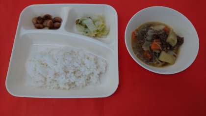 今日の献立は、「肉じゃが」「はくさいの甘酢づけ」「とら豆の煮もの」「ごはん」「牛乳」です。肉じゃがは子どもたちに人気の定番献立です。