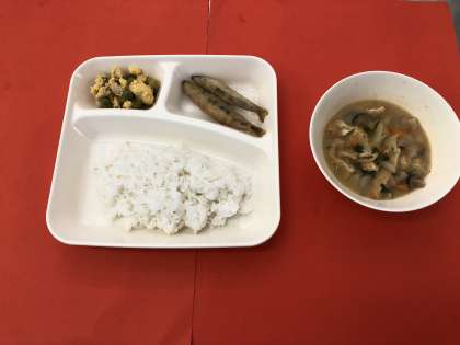 今日の献立は、「きびなごてんぷら」「みそ汁」「えんどうの卵とじ」「ごはん」「牛乳」です。えんどうが、たくさんとれておいしいのは春から夏の初めにかけてです。給食室でさやから豆をとりだし、調理しています。