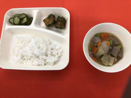今日の献立は、「ちくわのいそべあげ」「鶏肉とさといもの煮もの」「あっさりきゅうり」「ごはん」「牛乳」です。ちくわに、青のりの入った衣をつけて油であげる「いそべあげ」は毎回好評な献立です。卵を使っていないので、卵アレルギーのある子どもも食べることができます。