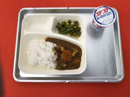 今日の献立は、「牛肉と大豆のカレーライス」「三度豆とコーンのサラダ」「ヨーグルト」「牛乳」です。大豆は、たんぱく質を多く含んでいるので、「畑の肉」と呼ばれています。