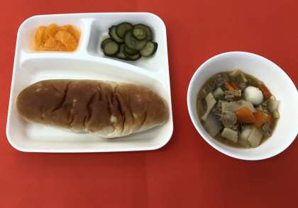 今日の献立は、「八宝菜」「きゅうりの中華あえ」「みかん(缶詰)」「おさつパン」「牛乳」です。初登場のおさつパンは、子どもたちにとても好評でした。