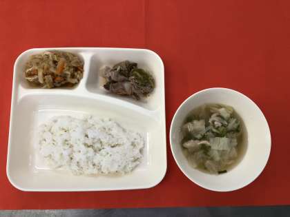 今日の献立は、「豚肉の梅風味焼き」「すまし汁」「切り干しだいこんのいため煮」「ごはん」「牛乳」です。切り干しだいいこんは、日本に昔から伝わる「乾物」のひとつです。乾燥させることによって生のだいいこんよりも、たんぱく質や糖質、カルシウム、食物繊維などが増加します。子どもたちに積極的に食べてほしい食品です。