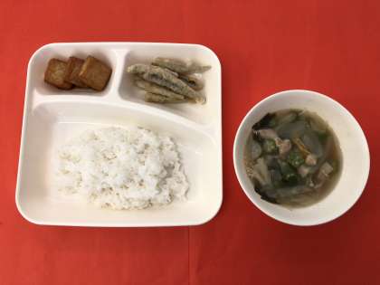 今日の献立は、「いわしてんぷら」「五目汁」「あつあげのしょうがじょうゆかけ」「ごはん」「牛乳」です。カラッと揚げたいわしてんぷらの食感を味わえます。
