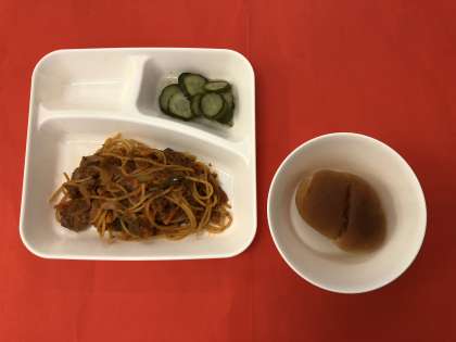 今日の献立は、「スパゲッティミートソース」「きゅうりのバジル風味サラダ」「黒糖クレセントロールパン」「牛乳」です。ブラウンルウで仕上げるスパゲッティは、毎回子どもたちにとても好評です。
