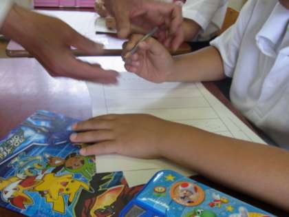 1年生は、「正しい鉛筆の持ち方ができるクジャク法」の本を出された本校の橋爪先生に5月末に鉛筆の持ち方を教えていただきました。