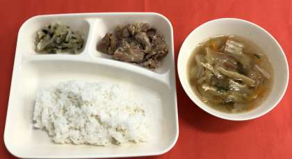 今日の献立は、「鶏肉のしょうゆマヨネーズ焼き」「五目汁」「切り干しだいこんのゆずの香あえ」「ごはん」「牛乳」です。