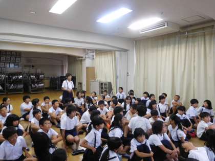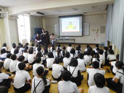 世界の難民に服を届けよう笑顔を届けようというプロジェクトです。5年生が活動の説明受けました。ユニクロより3名の講師の方にお越しいただきました。