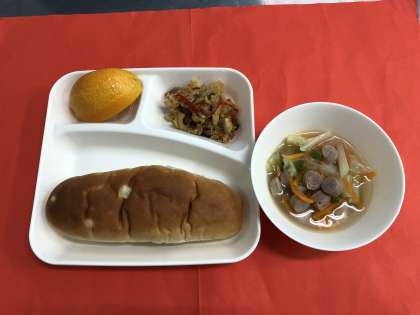 今日の献立は、「パエリア」「ウインナーとキャベツのスープ」「オレンジ」「おさつパン」「牛乳」です。パエリアは、スペインのバレンシア地方の代表的な料理です。