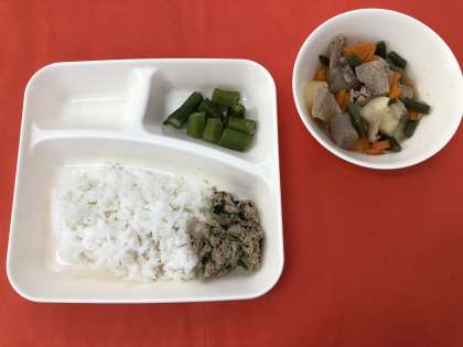 今日の献立は、「豚肉とじゃがいもの煮もの」「オクラの梅風味」「ツナっ葉いため」「ごはん」「牛乳」です。「オクラの梅風味」は、焼き物機で蒸したオクラを、梅の風味をほんのり効かせたタレであえます。