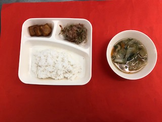 7月19日(木)の献立は、「ゴーヤチャンプルー」「すまし汁」「あつあげのみそだれかけ」「ごはん」「牛乳」です。ゴーヤチャンプルーは、沖縄の家庭料理です。給食では、年1回、7月のみ使用できるゴーヤ(にがうり)と豚肉、もやしを使用しています。食べる時に小袋のかつおぶしをかけることで、風味と旨みを添えています。