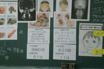 4年生は「かむことの大切さ」について学習しました。昔(卑弥呼がいたといわれる時代)と現在の食べ物を比べて、かむ回数がかなり違うことに驚きました。そして、かむことの効果について学びました。「かむ」と、こめかみが動き、脳が刺激され、脳の発達を促します。また、「かむ」と、消化を進め、胃の負担を減らします。更に、「かむ」と、食べ物を味わい、味覚を発達させます。健康にも学習にもよいことを知りました。かみごたえのある食品についても教わりました。