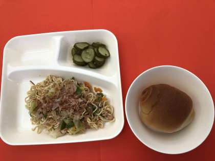 今日の献立は、「和風焼きそば」「きゅうりのゆず風味」「黒糖クレセントロール」「牛乳」です。豚肉を使ったしょうゆ味のいためめんで、子どもたちに人気があります。