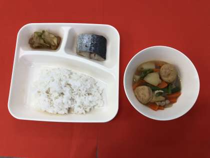 今日の献立は、「さごしの塩焼き」「じゃがいもと一口がんもの煮もの」「キャベツのおひたし」「ごはん」「牛乳」です。久しぶりの和食、とても好評でした。