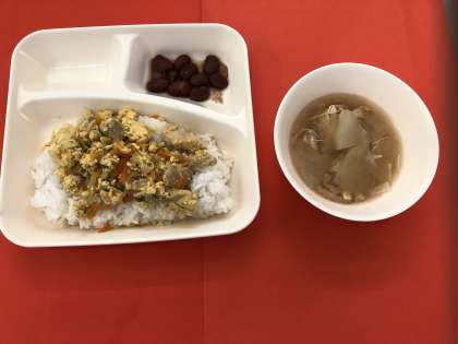 今日の献立は、「親子丼」「とうがんのすまし汁」「金時豆の煮もの」「牛乳」です。「親子丼」は、鶏肉と野菜などを甘辛く煮て、彩りに青ねぎを加えて卵でとじています。「卵」の除去を行うことができる個別対応献立です。金時豆は、鉄や食物繊維を豊富に含んでおり子どもたちに食べてほしい食材のひとつです。