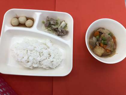 今日は、月見の行事献立「鶏肉とさといもの煮もの」「豚肉とキャベツのいためもの」「みたらしだんご」「ごはん」「牛乳」です。十五夜を『芋名月』ということや、さといもをお供えする風習が日本各地にあることにちなんで、さといもを使った煮ものと、月見だんごに見立てたみたらしだんごを組み合わせています。今年は9月24日が十五夜です。