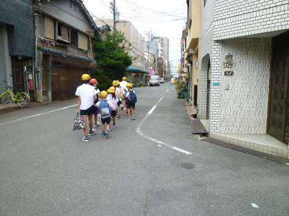 7月5日の土曜授業で、2年生と6年生で10人程のグループを作り、弁天の町をしました。2年生が6年生に公園や公共施設の場所や、おすすめの場所を教えてもらいました。