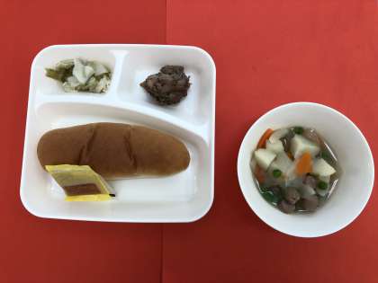 今日の献立は、「鶏肉の香草焼き」「スープ煮」「サワーキャベツ」「コッペパン・アプリコットジャム」「牛乳」です。鶏肉は、バジル、オリーブ油で下味をつけて焼いています。