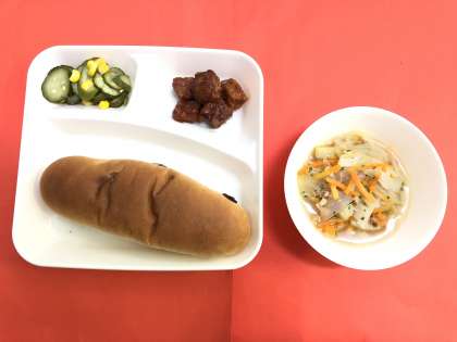 今日の献立は、「まぐろのオーロラ煮」「スープ」「きゅうりとコーンのゆずドレッシング」「レーズンパン」「牛乳」です。
