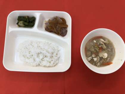 今日の献立は、「豚肉のしょうがじょうゆかけ」「けんちん汁」「三度豆のからしじょうゆあえ」「ごはん」「牛乳」です。こくのあるけんちん汁は体があたたまるメニューです。明日は、『ほうれん草のグラタン』が登場します。